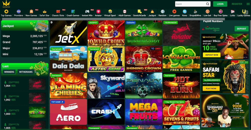 Marakumi Kenya proposes a wide range of slots: video slots, classic reels, megaways-style games and local favorites. The search bar and search by category filters to find themes, volatility levels and provider tags. The lobby sorts by popularity and new releases.